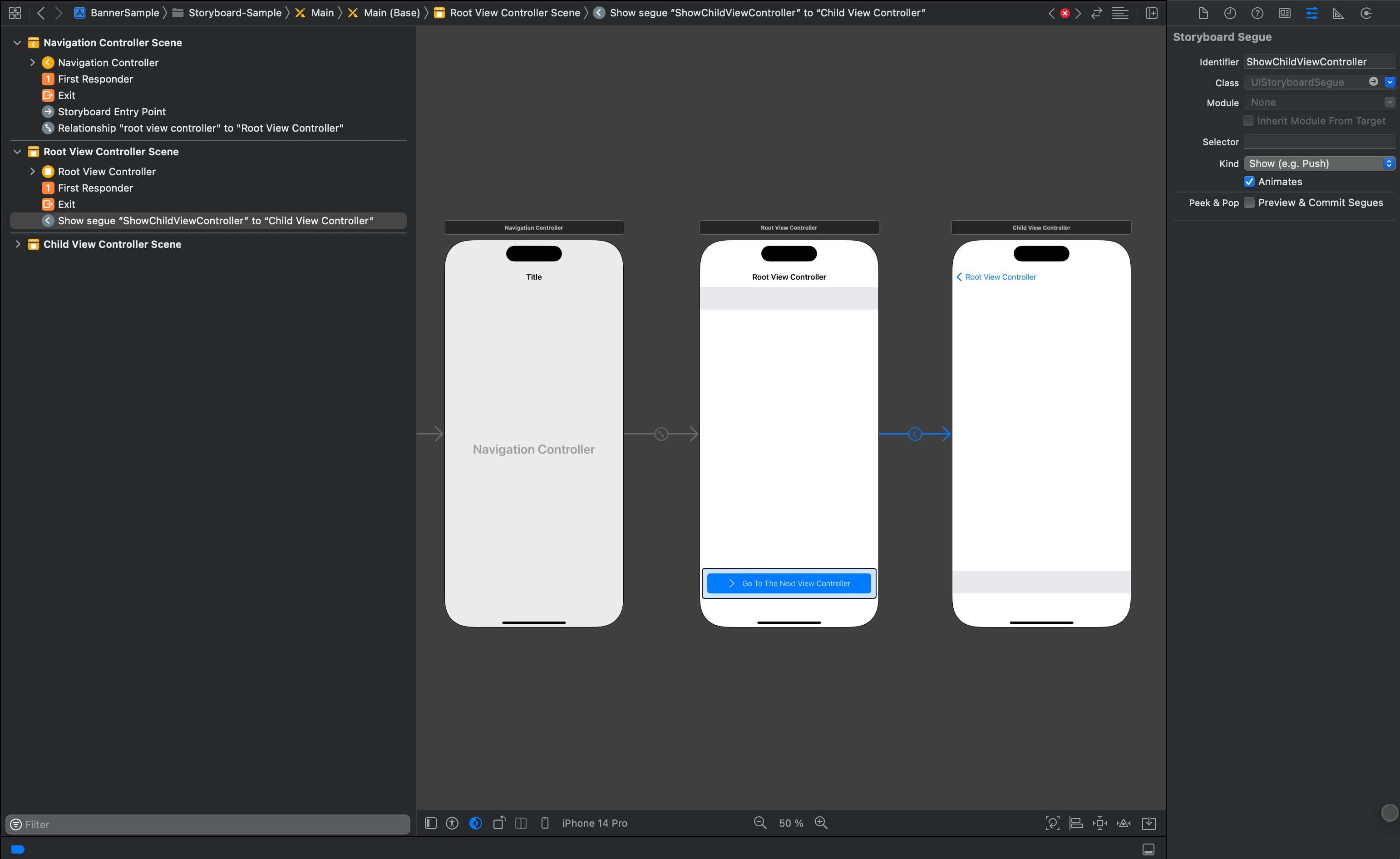 Даллее предложены несолько примеров: использование UIStoryboardSegue в Storyboard приложении и передача баннера в приложении с програмной навигацией с помощью UINavigationController.